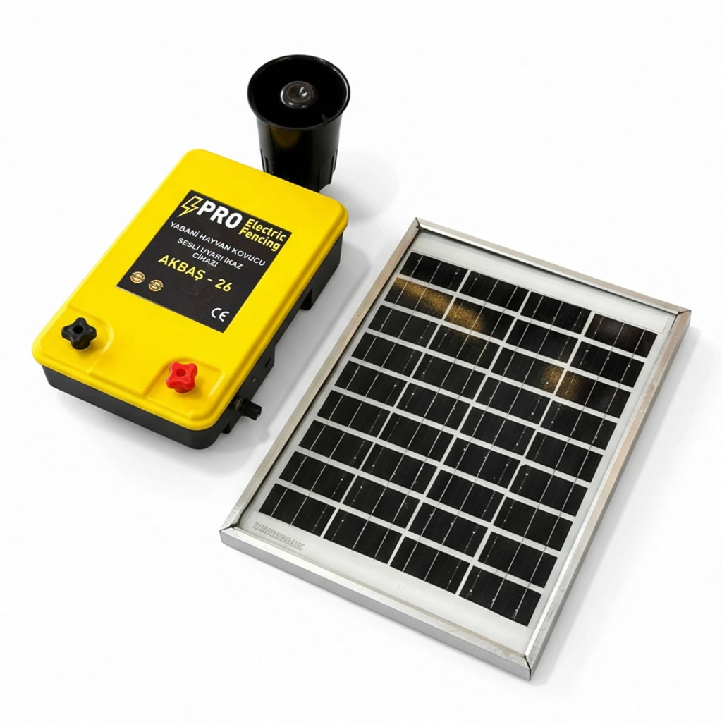 Akbaş-26 Güneş Panelli Yabani Hayvan Kovucu Sesli Uyarı İkaz Cihazı, tarla, bahçe, arı kovanı, bağ ve çiftlik alanlarını yabani hayvanlardan korumak için geliştirilmiş pratik ve etkili bir güvenlik cihazıdır. Güneş enerjisi ile çalışan yapısı sayesinde elektrik bağlantısına ihtiyaç duymadan uzun süre kesintisiz kullanım sağlar.
